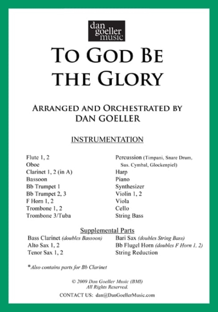 To God Be the Glory is an exhilarating setting of this classic hymn. Your church orchestra and congregation are sure to be inspired by this uplifting arrangement. This piece is the perfect way to give God the glory for the great things he has done!